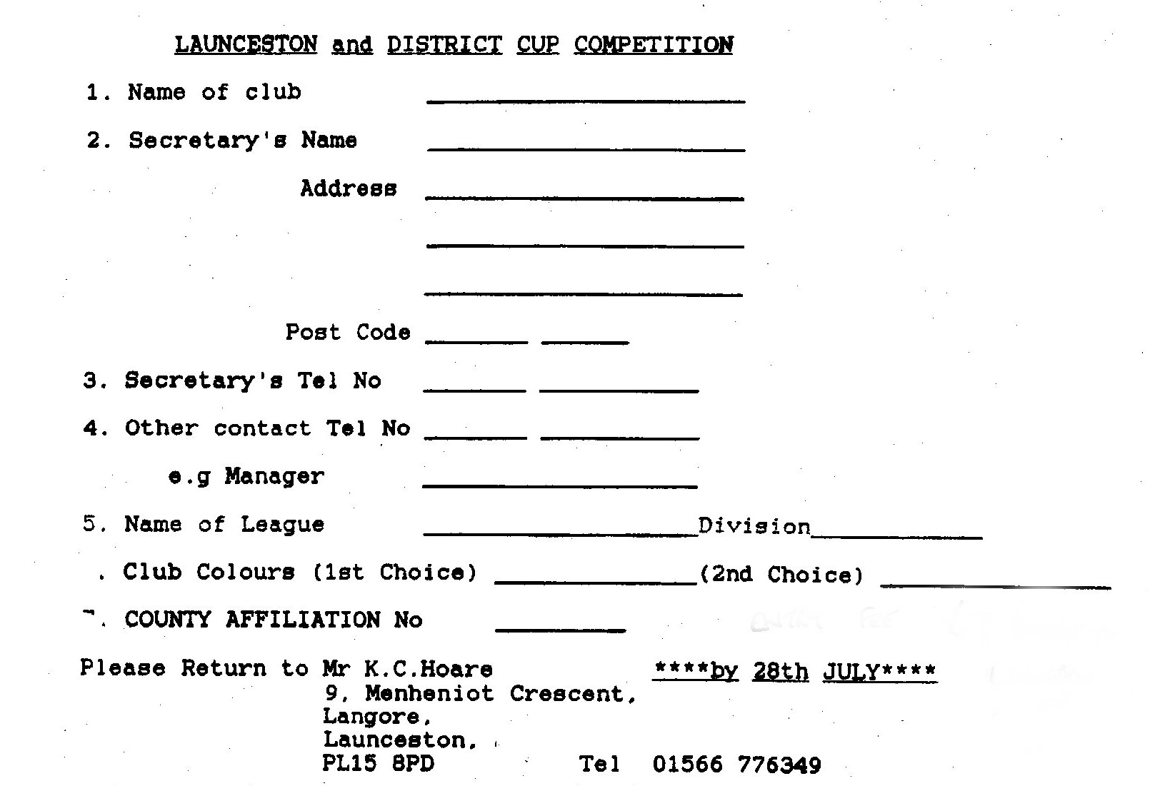 LAUNCESTON K.O Cup ENTRY FORM